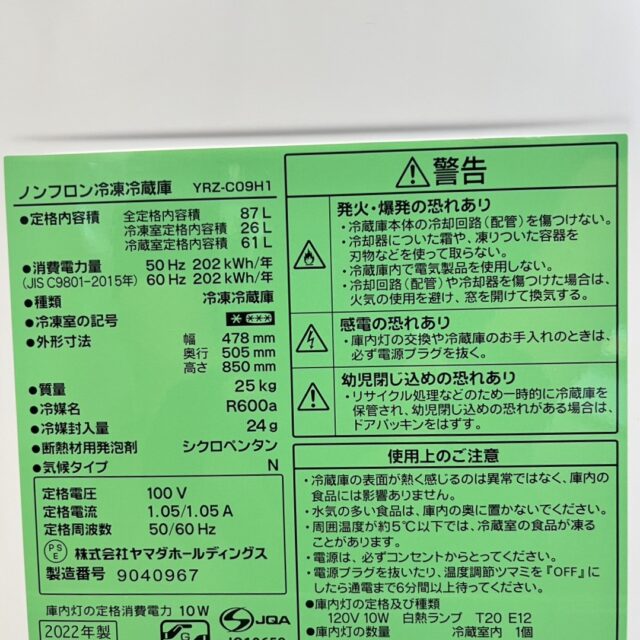 15,000円仕様型番 YRZ-C09H1 年式 2020 商品情報 ドア数:2ドア/定格内容積:87L/WxHxD:478x850x505mm/冷蔵・冷凍:61/26L/自動製氷:無/脱臭:無/省エネ基準達成率:100%(2021年度)